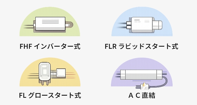電球によってはそれぞれの点灯式があります。同じ建物内でも混在していることが多く、取り付けの際には工事が必要な場合もありますが、エコデバイスのLEDランプはすべての方式が1本で完結します。